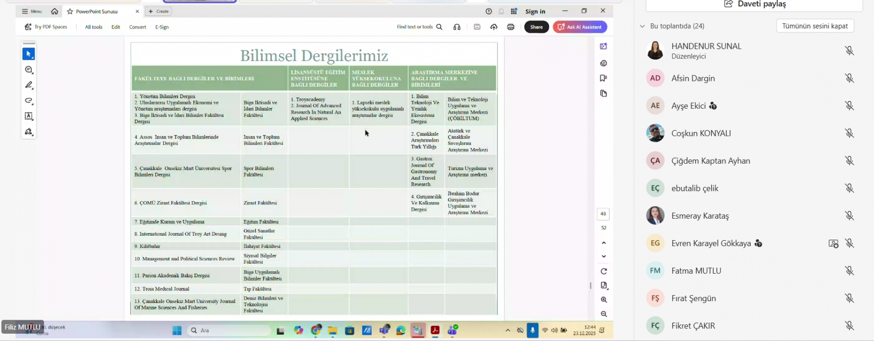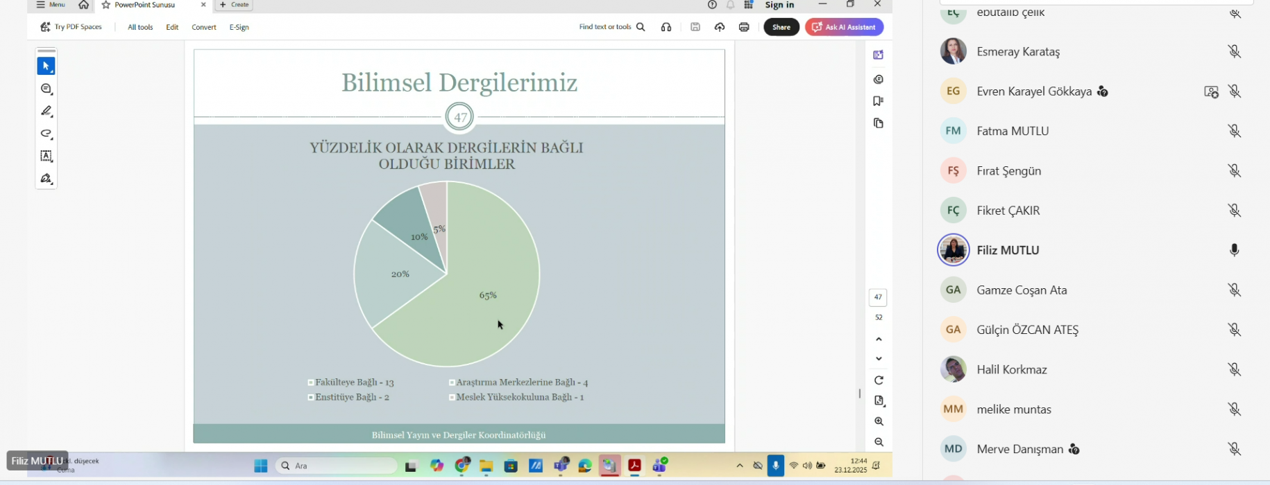 Üniversitemiz Bilimsel Yayın ve Dergiler Koordinatörlüğü tarafından düzenlenen “Bilimsel Yayın ve Dergiler Koordinatörlüğü Akademik Birim Temsilcileri Toplantısı”, 23.12.2025 tarihinde gerçekleştirilmiştir. Bu toplantıda; koordinatörlüğümüzün amaç ve hedeflerinin sunulması, Üniversitemiz bünyesinde yayımlanan bilimsel dergilerin mevcut durumunun değerlendirilmesi, akademik birimlerde yürütülen bilimsel yayın faaliyetlerinin genel olarak ele alınması, kurulması planlanan bilimsel dergi süreci hakkında bilgilendirme yapılarak akademik birim temsilcilerinin görüşleri alınmıştır. Toplantı sunumu ekte yer almaktadır.