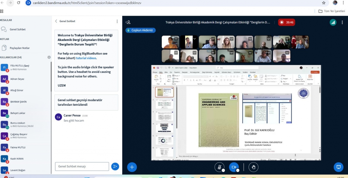 Trakya Üniversiteler Birliği 2026 yılı Akademik Dergi Çalışmaları kapsamında düzenlenen “Dergilerin Durum Tespiti” etkinliği, 3 Nisan 2026 tarihinde Bandırma Onyedi Eylül Üniversitesi ev sahipliğinde Bilimsel Dergiler Koordinatörü Prof. Dr. Çağatay Başarır başkanlığında gerçekleştirildi.